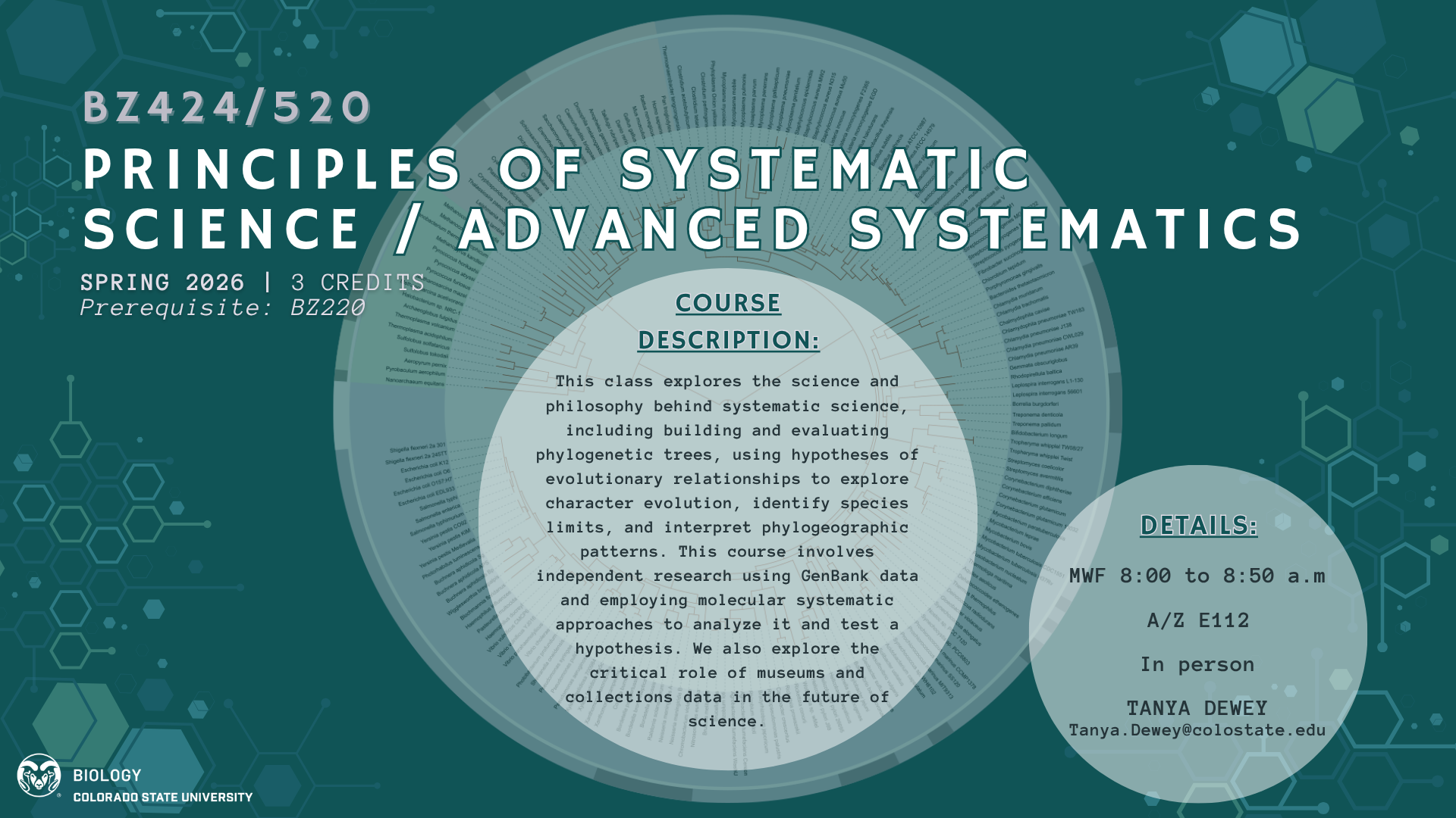 Students interested in developing and evaluating phylogenetic hypotheses and the many real-world applications of systematic science should consider this course, which allows them to develop research skills relevant to evolutionary biology.